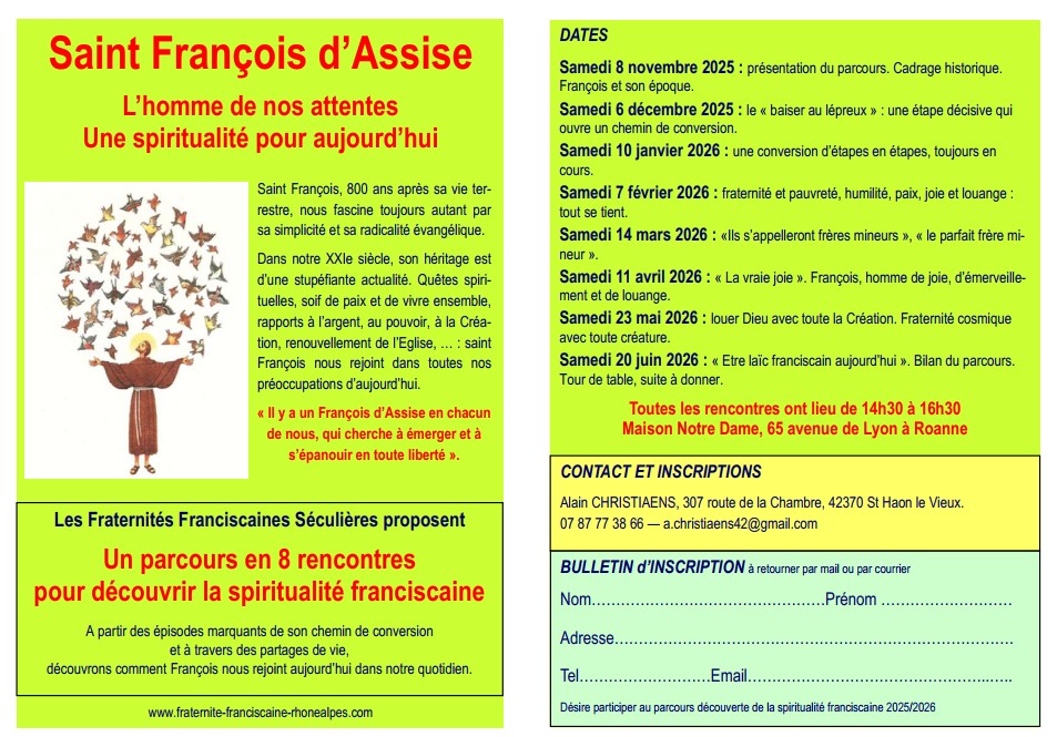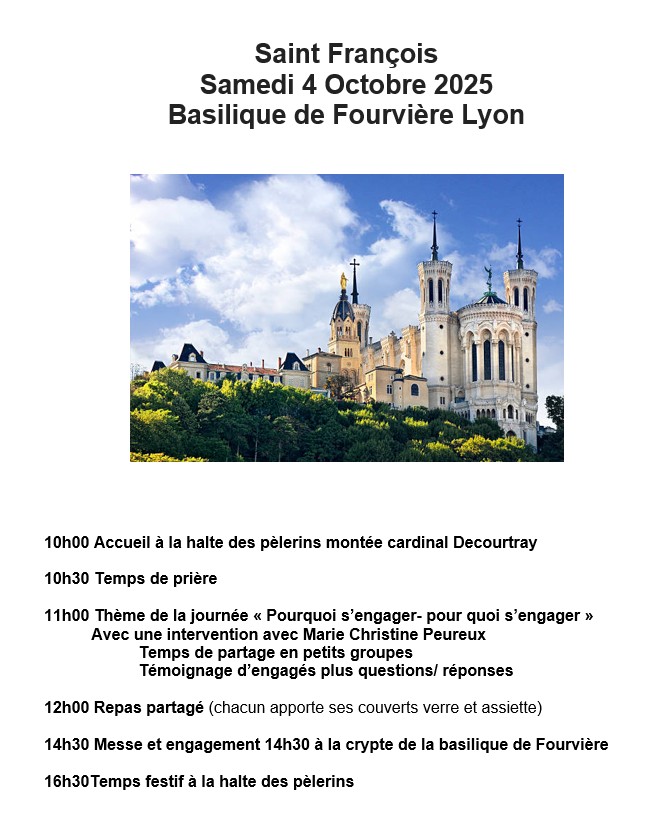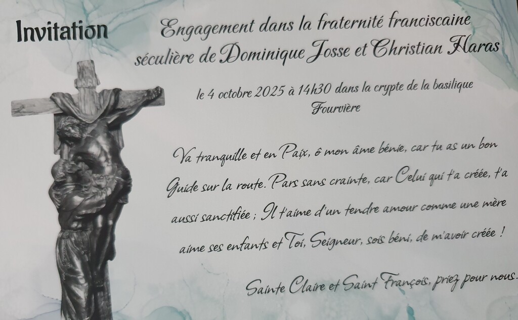 Claire et François, Greccio, Franciscain d’Ars, L’Alverne, Les amis de Saint François, Saint Damien, Talitha Koum, Pace E bene , Saint Bonaventure et Pauline Jaricot